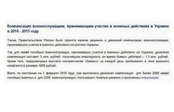 У викладених матеріалах також зазначено, що, за рішенням російського уряду, компенсація сім'ям загиблих військових, які брали участь у бойових діях в Україні, становить 3 млн. рублів, а тим, хто отримали інвалідність під час бойових дій, – 1,5 млн рублів. Виплата контрактникам «бойових» за кожен день перебування в зоні військового конфлікту становить 1,8 тисячі рублів.