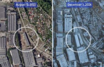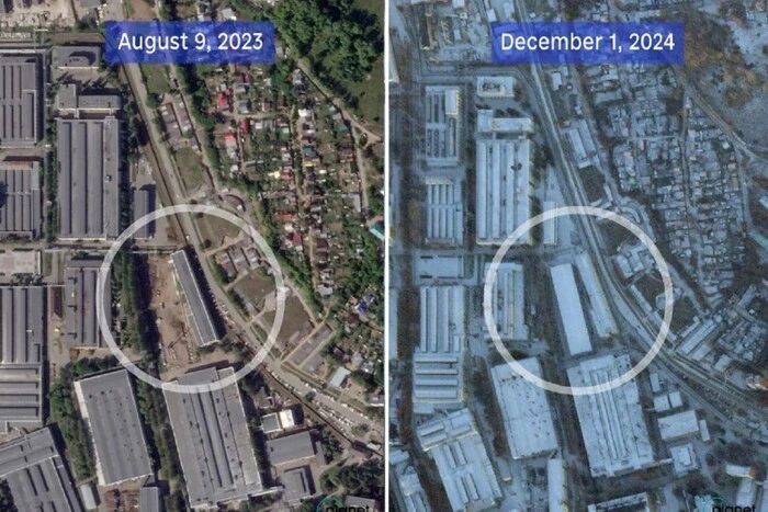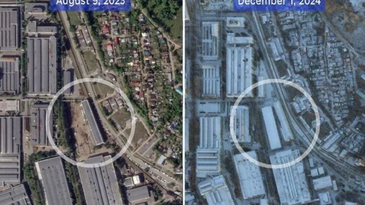 Фотографії нового цеху на Воткінському ракетному заводі, збудованого у 2024 році, а також супутникові знімки, що показують його розташування фото: Kyiv Independent / Воткінський завод, телеканал «Звезда», Planet Labs PBC, Google Street View.