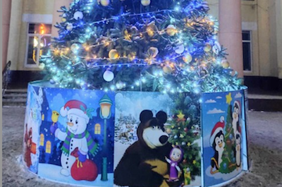 "У селищі Коцюбинське в Бучанському районі Київської області, встановили святкову інсталяцію до зимових свят. Ялинку прикрасили парканом з зображенням героїв російського мультфільму "Маша і Мєдвєдь", а також радянських персонажів "Дєда Мароза та Снєгурочкі"!