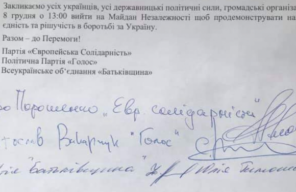 Лідер ВО "Батьківщина" Юлія Тимошенко підписала заклик трьох партій вийти в Києві на "Майдан миру", однак ані на сайті партії, ані на її сторінці у Фейсбуці про цей документ не згадано жодного слова. Опублікована лише заява від 3 грудня про "червоні лінії", які цих три партії не дозволяють перетнути Президентові України Володимиру Зеленському під час його ймовірних домовленостей з президентом Російської Федерації Владіміром Путіним у Парижі 9 грудня.