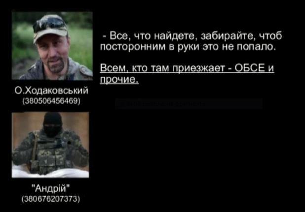 Так, один із співрозмовників, якого СБУ ідентифікувала, як командира батальйону «Восток» терористичної організації «ДНР» Олександра Ходаковського, цікавиться, чи знайшли «чорні скриньки». «Давай, оперативно, Москва цікавиться, де «чорні скриньки». Доповіси мені, треба оперативно дізнатися», – говорить він.