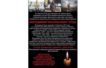 «4 листопада Львів попрощається з трагічно загиблим на сході України викладачем Володимиром Трушем. Заупокійна Літургія відбудеться у Церкві Святої Анни (вулиця Городоцька, 32). Поховають Володимира Труша на Личаківському кладовищі на полі почесних поховань №76», – повідомили «Щоденному Львову» в прес-службі міської ради, де також поінформували:
