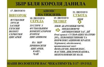 Активісти громадської ініціативи «Допоможи фронту» розмістили на своїй сторінці в інтернет-мережі «Facebook» ілюстроване повідомлення про те, яку допомогу волонтери збиратимуть бійцям 17-19 і 21 лютого (зі 17. 00 до 19.00) біля пам’ятника королю Данилу на площі Галицькій у Львові. На сторінці громадської ініціативи «Допоможи фронту» в інтернет-мережі «Facebook» повідомляється також: