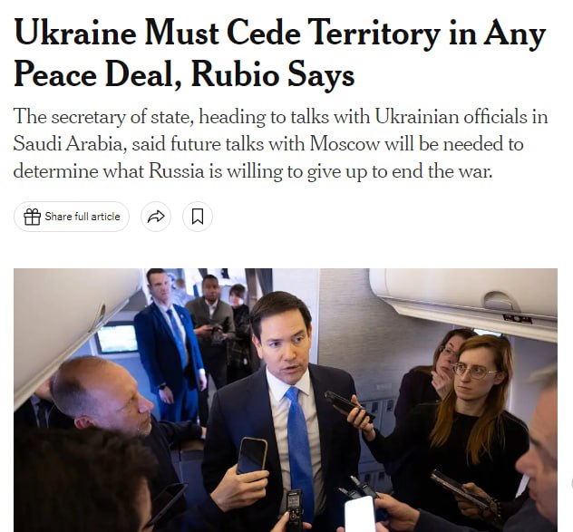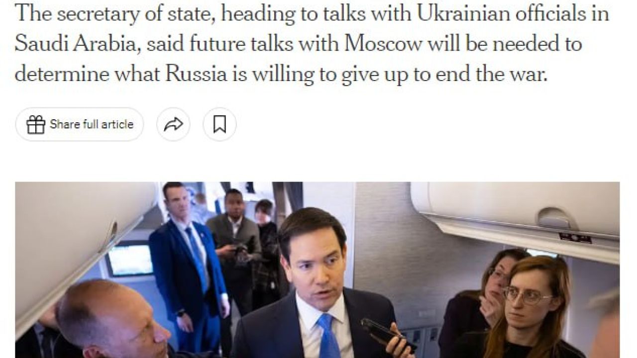 Про це повідомляє Нью-Йорк Таймс, пише DailyLviv.com. Марко Рубіо, прямуючи на переговори з українськими офіційними особами в Саудівській Аравії, сказав, що майбутні переговори з Москвою будуть необхідні, щоб визначити, чим Росія готова поступитися, щоб припинити війну.