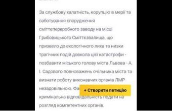 Активіст Всеукраїнського об’єднання «Свобода» повідомив сьогодні, 31 травня, вночі на своїй сторінці в інтернет-мережі «Facebook»: «Зареєстрував петицію про відставку Садового. Після модерації скину лінк всім охочим і небайдужим».