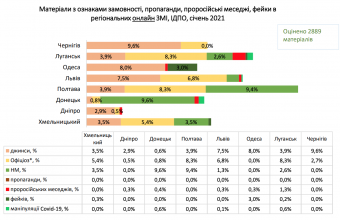18,4% публікацій у друкованих регіональних виданнях восьми областей становлять сумнівні матеріали, що є немаркованою рекламою, або містять ознаки замовності, пропаганди, фейків. В онлайн виданнях таких матеріалів 13%. Трендовими темами замовності в січні 2021 року стали підвищення тарифів, українська мова у сфері обслуговування разом із просуванням онлайн-магазинів.