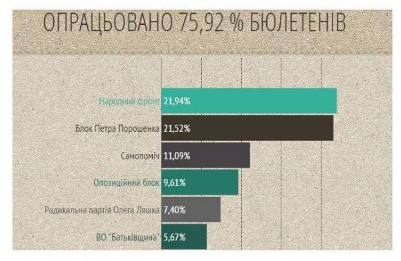 Центральна виборча комісія опрацювала 75,92% електронних протоколів дільничних виборчих комісій на позачергових парламентських виборах. За даними ЦВК, партія «Народний фронт» збільшує відставання від «Блоку Петра Порошенка» майже на 50 тисяч голосів та набирає 21,94%.