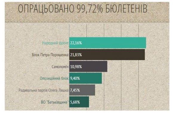І після опрацювання Центральною виборчою комісією України 99,69% електронних протоколів дільничних виборчих комісій на позачергових парламентських виборах «Народний фронт» продовжує перемагати з 22,16 % голосів, а «Блок Петра Порошенка» набирає 21,83%, «Об'єднання «Самопоміч» – 10,98 %. «Опозиційний блок» – 9,40%, Радикальна партія – 7,45% і «Батьківщина» – 5,68 %.