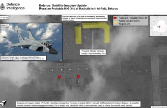Британська розвідка в сьогоднішньому огляді війни РФ проти України припустила, що РФ могла завезти до Білорусі гіперзвукові ракети „Кинджал“, які можуть запускатися з МіГ-31К ВКС РФ, що дислокуються на аеродромі в Мачулищах.