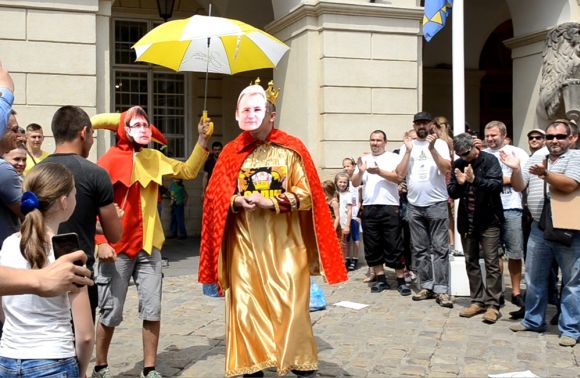 Зокрема, можна було побачити такі написи «Будинки воїнам АТО у стилі фігвам», «2006 рік – відкрив сміттєпереробний завод», «Більше мільярда гривень боргів», «Наобіцяв і не зробив громадську раду при ЛМР» та інші. З початком вистави на імпровізовану сцену під фанфари вийшов придворний шут «Шівців» в масці радника Садового, керівника «Об'єднання «Самопоміч» Андрія Шевціва.