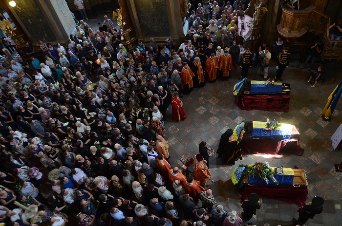 «У Львові попрощалися з трьома військовослужбовцями, які загинули в ніч з 11 на 12 липня під Зеленопіллям внаслідок обстрілу з «Граду». Літак з тілами солдатів прибув на львівське летовище близько полудня.