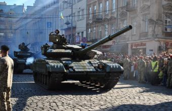 На марші представили також трофейний танк Т-72, який ході проведення АТО був захоплений українськими військовими та бойову машину Т-64БВ– модернізацію українських майстрів танкобудування із Харкова. Проспектом Свободи рухались повнопривідні восьмиколісні бронетранспортери БТР-4Е «Буцефал», розроблені у Харкові, із встановленими українськими бойовими модулями «Парус».