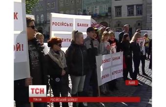 «У Львові активісти організації «Бойкот російських товарів» пікетували відділення одного з банків. Люди вимагають, щоб російська фінансова установа закрилася у Львові і в Україні зокрема.