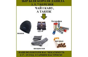 Активісти громадської ініціативи «Допоможи фронту» розмістили на своїй сторінці в інтернет-мережі «Facebook» ілюстроване повідомлення про те, що вони знову збиратимуть сьогодні, 3 березня, біля пам’ятника королю Данилу на площі Галицькій для наших бійців на передовій.