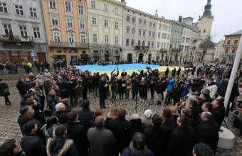 Сьогодні, 10 березня, на площі Ринок, перед міською Ратушею, розгорнули національний прапор України, а відтак, заспівали Державний Гімн України.