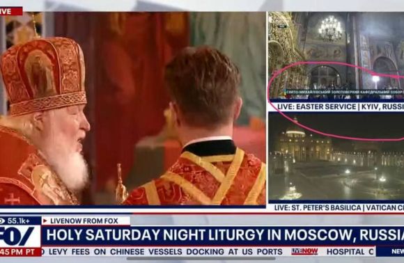 В кафедральному соборі Христа Спасителя у Москві традиційно відбувається служба до Великодня. На богослужінні були присутні очільник Кремля Путін і мер російської столиці Собянін, а церемонію очолив патріарх Кіріл. Fox News включив цю подію до свого великоднього ефіру, який охоплював трансляції релігійних служб з усього світу, зокрема месу Папи Римського у Ватикані, звернення з Ізраїлю та службу з Михайлівського Золотоверхого собору в Києві.