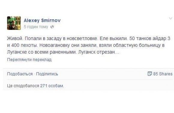 Московський кінорежисер Алєксєй Смірнов, який активно підтримує «Лугандон» і до недавніх пір перебував у селищі Новосвітлівка в Краснодонському районі Луганщини, повідомляє сьогодні, 15 серпня, на своїй сторінці в інтернет-мережі «Facebook», що українські війська визволили Новоганнівку (село в тому ж районі) й зайняли лікарню в Луганську, відрізавши таким чином його від кордону з Росією. Він також пише, що, потрапивши в засідку в Новосвітлівці, ледве вижив.