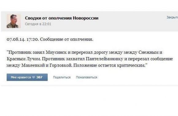 «Противник зайняв Міусинськ і перерізав дорогу між Сніжним і Красним Лучом. Противник захопив Пантелеймонівку й перерізав сполучення між Макіївкою й Горлівкою. Положення залишається критичним».