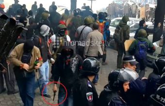 Міліції поки що не вдається відновити порядок. Прихильники єдиної України в основному озброєні тротуарною плиткою. Як щити вони використовують кришки від сміттєвих баків, дорожні знаки і металеві огорожі».