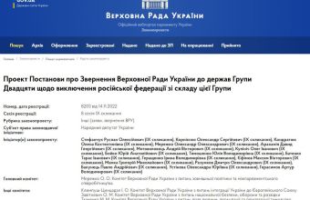 "Враховуючи визначну роль G20 в підтриманні сталого розвитку світової економіки на благо всіх народів, а також враховуючи, що добробут держав світу напряму залежить від їх здатності підтримувати мир і безпеку і взаємодіяти на цьому напрямку між собою на основі норм міжнародного права, Верховна Рада України має намір звернутися до держав Групи Двадцяти щодо виключення російської федерації зі складу цієї групи, як такої, що не підпадає під жодний із названих критеріїв",- йдеться в проєкті постанови.