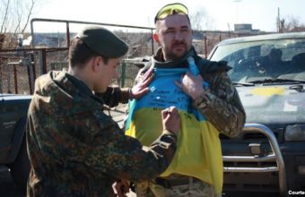Білий автомобіль із наліпленими жовтими стрічками заїжджає глибоко в ліс. Бус зустрічають військові. «Слава Україні!», – звучить від них, у відповідь лунає «Волонтерам Слава!»