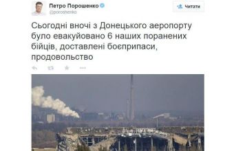 Петро Порошенко повідомив у неділю у «Тwitter»: «Сьогодні вночі з Донецького аеропорту було евакуйовано шістьох наших поранених бійців, доставлені боєприпаси, продовольство».