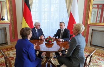У вівторок, 12 квітня, президентська пара Німеччини: президент Франк-Вальтер Штайнмаєр і перша леді Ельке Бюденбендер відвідали Польщу. На спільній пресконференції президент Польщі Анджей Дуда привітав Штайнмаєра з перемогою на виборах і висловив радість, що Польща стала першою країною, яку відвідав президент Німеччини після свого переобрання. Про це повідомила Українська служба Польського радіо, пише Dailylviv.com.