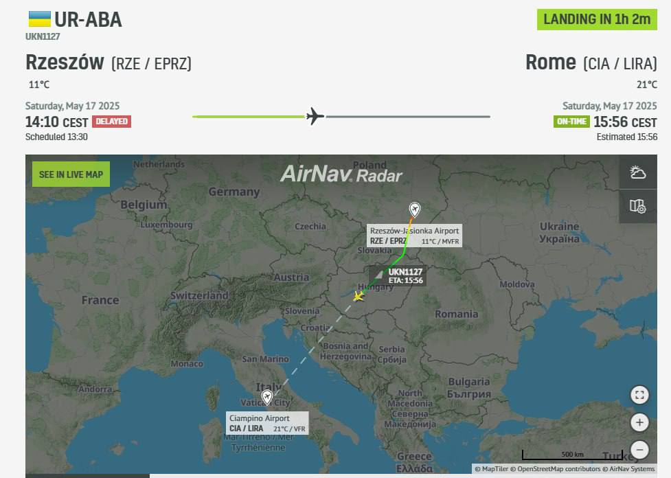 Як зазначено, борт Зеленського вилетів з Ряшева до Риму. У столицю Італії він має прибути о 15.56.