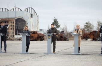 Лідери урядів Італії, Бельгії та Канади, а також президентка Європейської комісії Урсула фон дер Ляєг разом з президентом України Володимиром Зеленським відвідали аеропорт «Антонов» у Гостомелі, на якому намагалися десантуватися російські війська на початку вторгнення 24 лютого.