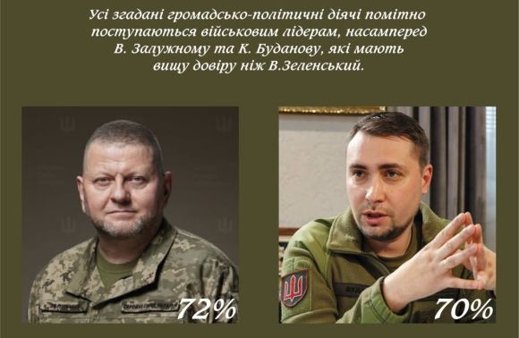 Серед же списку діячів зі сфери оборони всі мають позитивний баланс довіри-недовіри. Найкраще респонденти ставляться до Валерія Залужного (72% довіряють, 21% не довіряють) і до Кирила Буданова (70% довіряють, 19% не довіряють).