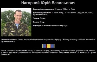 «Львів прощається з Героєм Юрієм Нагорним (24.10.1988-11.07.2014). Юрій служив у 24-тій механізованій бригаді і загинув під Зеленопіллям. Весь цей час тривала ДНК-експертиза на встановлення особи», – повідомили сьогодні, 26 листопада, «Щоденному Львову» в прес-службі міської ради, де також поінформували: