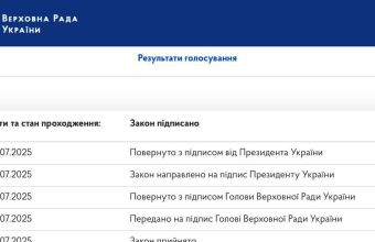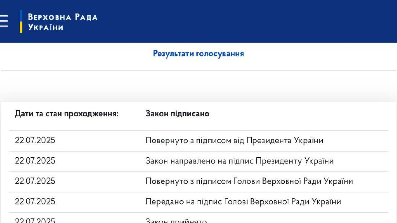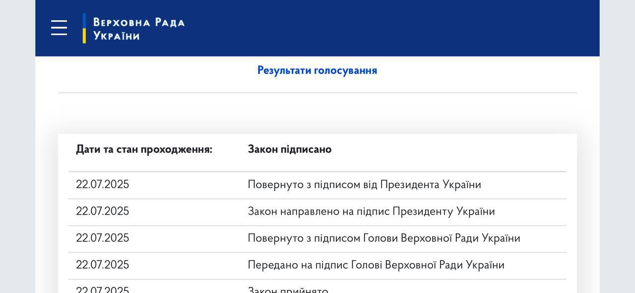 У графі "Закон підписано" з'явилося повідомлення "Повернуто з підписом від Президента України".