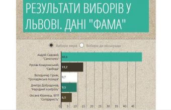 «У Львові, відповідно до результатів опитування, у виборчій гонці лідирує чинний мер міста Андрій Садовий. Такі результати опитування виборців на виході з дільниць у день голосування 25 жовтня, оприлюднило соціологічне агентство «Фама». За результатами екзит-полу, перша п'ятірка лідерів на посаду міського голови виглядає так: