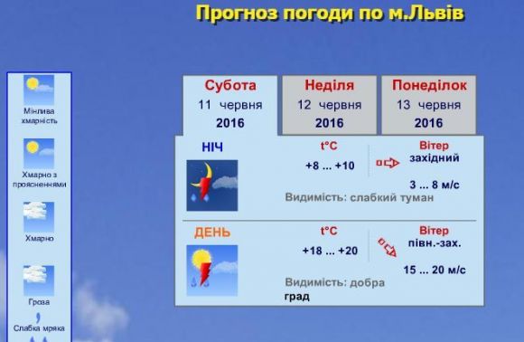 «Метеорологічна обстановка 11 червня: мінлива хмарність, вдень по всій території – короткочасні дощі, грози, в окремих районах – град, вранці подекуди – туман, вітер –західний, 7-12 метрів за секунду, під час гроз– пориви та шквали 15-20, температура повітря вдень –16-21° тепла», – повідомили сьогодні, 11 червня, на сайті департаменту з питань цивільного захисту Львівської обласної державної адміністрації.