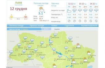 «Метеорологічна обстановка: 12 грудня на окремих ділянках доріг – ожеледиця. Вранці та вдень місцями – пориви західного вітру 15-20 метрів за секунду. Погода: фактична –мінлива хмарність без істотних опадів, вітер північно-західний, 3-8 метрів за секунду, температура повітря – від -2º до 5° тепла; прогноз – мінлива хмарність, невеликі опади у вигляді дощу та мокрого снігу, вітер – західний, 7-12 метрів за секунду, пориви до 15-20 метрів за секунду, температура повітря вдень – 1 - 6° тепла», – повідомили сьогодні, 12 грудня, на сайті департаменту з питань цивільного захисту Львівської обласної державної адміністрації.