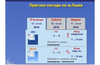 «Метеорологічна обстановка 15 січня – на дорогах ожеледиця, вдень місцями – налипання мокрого снігу. Погода: фактична – хмарно, на дорогах – ожеледиця, вітер – південно-західний, 3-5 метрів за секунду, прогноз: хмарно, в другій половині дня – сніг та мокрий сніг, місцями – налипання мокрого снігу, на дорогах – ожеледиця, вітер – південно-західний, 7-12 метрів за секунду, температура повітря вдень – від 4° морозу до 1° тепла», – повідомили сьогодні, 15 січня, на сайті департаменту з питань цивільного захисту Львівської обласної державної адміністрації.