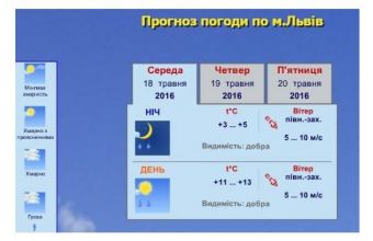 «Львівський регіональний центр з гідрометеорології інформує, що сьогодні у Львові зі збереженням до кінця доби – гроза й град. Завтра, 19 травня, – мінлива хмарність, вночі – без істотних опадів, вдень – короткочасний дощ. Вночі та вранці – туман видимістю 200 – 500 метрів. Вітер – південно-західний, 5-10 метрів за секунду. Температура повітря вночі 2-4° тепла, вдень 16-18° тепла.