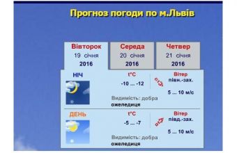 «Завтра буде південний вітер 5-10 метрів за секунду. Температура повітря вночі – 12-14° морозу, вдень – 5-7° морозу.