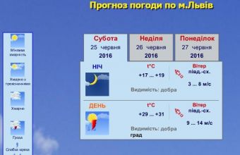 «Львівський регіональний центр з гідрометеорології інформує, що завтра, 25 червня, у Львові мінлива хмарність, вночі – без істотних опадів, вдень – короткочасний дощ, гроза, град. Вітер південно-східний, вночі – 3-8 метрів за секунду, вдень – 9-14 метрів за секунду, поривчастий. Температура повітря вночі – 17-19° тепла, вдень – 29-31° тепла.