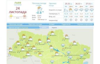 «26 листопада: хмарна погода з проясненнями. Вночі та вранці – мокрий сніг, подекуди – налипання мокрого снігу. Вдень – без істотних опадів. На дорогах – ожеледиця. Вітер – південно-східний, 5-10 метрів за секунду. Температура повітря вночі коливатиметься від 4° морозу до 1° тепла, вдень – від 2° морозу до 3° тепла».