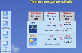 «Львівський регіональний центр з гідрометеорології інформує, що завтра, 27 липня, у Львові вдень місцями – короткочасні дощі, грози. Вночі та вранці – слабкий туман. Вітер – південно-східний, 7-12 метрів за секунду, поривчастий. Температура повітря вночі – 16-18° тепла, вдень 30-32° – тепла.