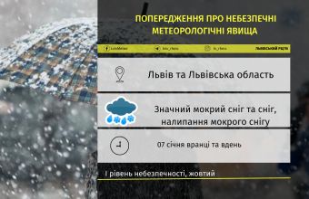 "7 січня на дорогах ожеледиця. Вночі місцями ожеледь. Вранці та вдень: значний мокрий сніг та сніг, подекуди налипання мокрого снігу; пориви північно-східного вітру 15 – 20 м/с, місцями хуртовини. (І рівень небезпечності, жовтий)", - попереджає Львівський гідрометеорологічний центр.