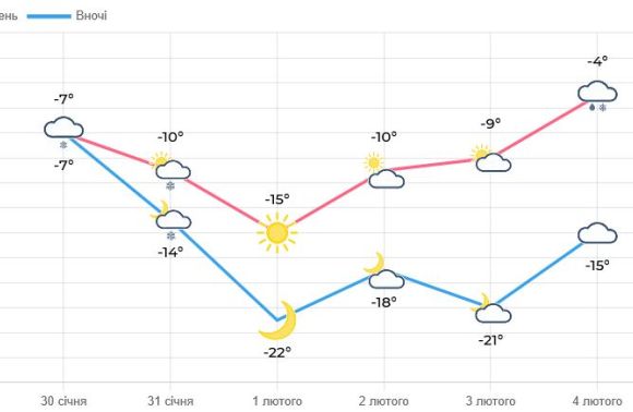 Неділя, 1 лютого. Очікується пік похолодання. Вночі температура опуститься до 15–20° морозу, а місцями — до -25°C. Вдень стовпчики термометрів покажуть 7–12° морозу.