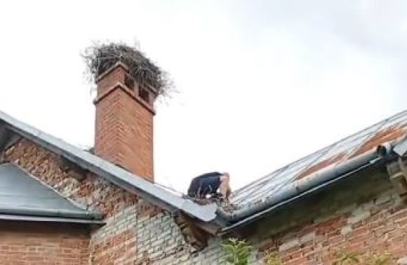 Молодий лелека випав з гнізда, заплутався в гіллі на даху і не міг самостійно вибратися.
