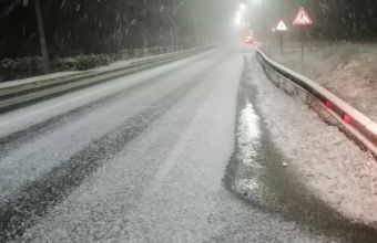 "Отака ситуація зараз в районі населеного пункту Новий Милятин. На відрізку з 480 км по 500 км автодороги М-06 Київ — Чоп. Сильні опади мокрого снігу. Просто врахуйте, що сьогодні вже будуть складніші умови для пересування", - застерігає патрульна поліція.