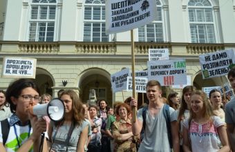 Як інформував «ЩЛ», активісти закликають перешкодити вирубці дерев у сквері Святого Юра, а «свободівці» заглушили мегафонами протестувальників.