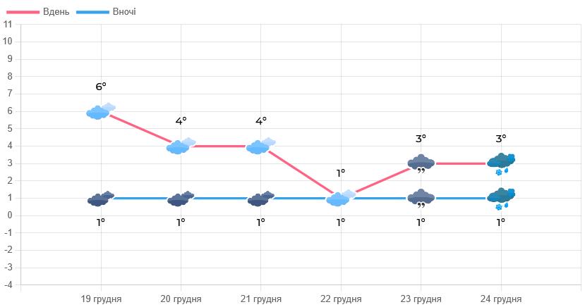 20 грудня у Львівській області буде мінлива хмарність. Вночі без опадів, вдень невеликий дощ. Вночі та в першій половині дня місцями туман, слабка ожеледь. Вітер змінного напрямку, 2 – 7 м/с. Температура вночі від 1° морозу до 4° тепла, вдень 3 – 8° тепла.