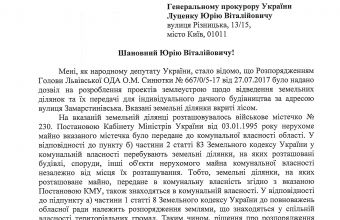Сьогодні, 11 серпня, секретар Комітету Верховної Ради України з питань екологічної політики, природокористування та ліквідації наслідків Чорнобильської катастрофи Остап Єднак і голова Комітету Верховної Ради України у закордонних справах Ганна Гопко офіційно звернулися до Генерального прокурора Юрія Луценка щодо перевірки законності розпорядження голови Львівської облдержадміністрації Олега Синютки №667/0/5-17 від 27 липня 2017 року про дозвіл для індивідуального дачного будівництва на 15 гектарах лісу вздовж вулиці Замарстинівської під Львовом.