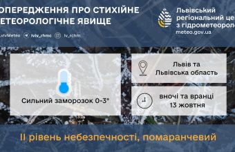 У місті Львові 13 жовтня вночі та вранці сильний заморозок 0 – 2° (ІІ рівень небезпечності, помаранчевий).
