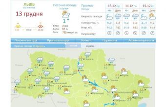 «Вдень 13 та вночі 14 грудня – опади (від помірних до невеликих) переважно у вигляді мокрого снігу та снігу (вдень 13 грудня місцями – з дощем). На дорогах – ожеледиця. Температура повітря вдень 13 грудня – 1-6 тепла, 14 грудня впродовж доби – від трьох морозу до двох тепла.